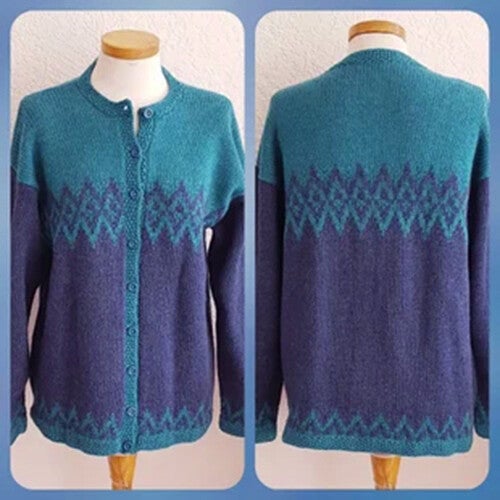 Het vest is gebreid van de Peruvian van Filcolana met nld. nr. 5. Er zit een klein stukje fair-isle techniek in maar dat maakt het juist mooi. Verder is het een recht wijdvallend model.