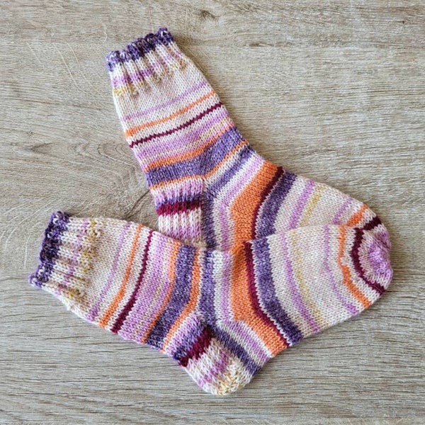 Handgebreide sokkenMaat: 24/25Boordhoogte: 10 cmVoetlengte: 15.5 cmMateriaal: 75% wol / 25% polyamideMachine wasbaar