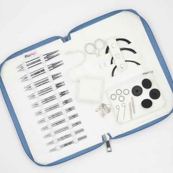 De KnitPro Nova Regal verwisselbare rondbreinaaldenset is een complete set met verwisselbare breinaaldpunten en accessoires. De naaldpunten in deze set zijn gemaakt van messing en hebben een glimmend, zilverkleurig oppervlak. De lichtgewicht naaldpunten zorgen voor een soepele brei-ervaring zonder dat je handen vermoeid raken. Met de geleidelijk taps toelopende punten steek je makkelijk in, zonder dat je garen splijt. Bovendien zorgen de naaldpunten voor een prachtige stekendefinitie. Door het duurzame materiaal heb je jarenlang plezier van deze naalden. De naaldpunten verbind je eenvoudig door het handige schroefsysteem met een stalen kabel, die omhuld is met een laagje nylon. Hierdoor is de kabel stevig en flexibel tegelijk en glijden de steken moeiteloos van de naaldpunten naar de kabel. De kabel is bovendien voorzien van het handige swivel-systeem, waardoor de naaldpunten ongehinderd rond kunnen draaien. Hierdoor kan de kabel niet gaan knikken of kronkelen. De kabels zijn aan de uiteinden voorzien van een gaatje waarin het kabelsleuteltje past waarmee de naaldpunt aan de kabel wordt bevestigd. De gaatjes zijn ook handig voor het aanbrengen van een hulpdraad (of lifeline) in het breiwerk om het werk veilig uit te halen of om gevallen steken op te halen. De KnitPro Nova Regal set bevat het volgende: