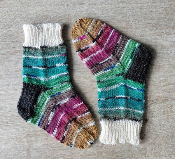 Handgebreide sokkenMaat: 24/25Boordhoogte: 10 cmVoetlengte: 15.5 cmMateriaal: 75% wol / 25% polyamideMachine wasbaar