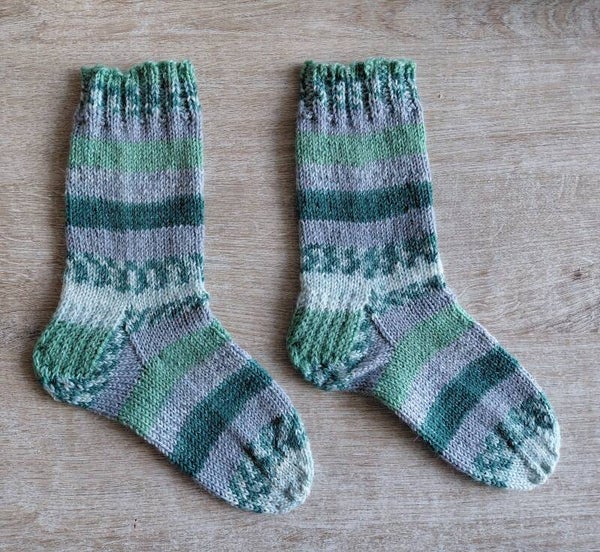 Handgebreide sokkenMaat: 26/27Boordhoogte: 10 cmVoetlengte: 17 cmMateriaal: 75% wol / 25% polyamideMachine wasbaar